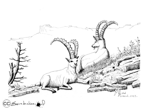 Bouquetins couchés. Posted on 20th janvier 2026, by admin under *** Rhône-Alpes · ****** Drôme · ********* Vercors · Faune & flore Titre : Bouquetins couchés. Auteur : Arnaud Michel Dimensions : 24 x 18 cm Ref : 2024-14